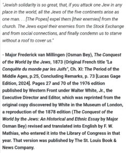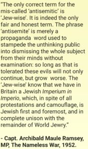 “The cry of “anti-Semitism” is the stock-in trade of the Zionist. It is at once his chief defence and his closest consolation. It has become his “badge of suffering” which he proudly wears like a medal. Whenever he needs or wishes to excuse his conduct or explain to himself his unpopularity with Gentiles, he murmurs to himself, or screams to the world, the charge of “anti-Semitism”. For, being a Jew, it would never occur to him that he, himself, might be the offending party.”