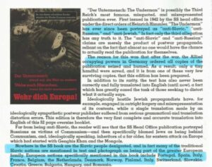 First issued in 1942 by the SS head office under the direct orders of Heinrich Himmler, The Underman has ever since been portrayed as “anti-Slavic,” “anti-Russian,” and “anti-Jewish.” In fact only the third allegation has any truth to it. The “anti-Slavic” and “anti-Russian” claims are merely the product of postwar propaganda, reliant on the fact that almost no one would have the chance to actually read the publication for themselves.