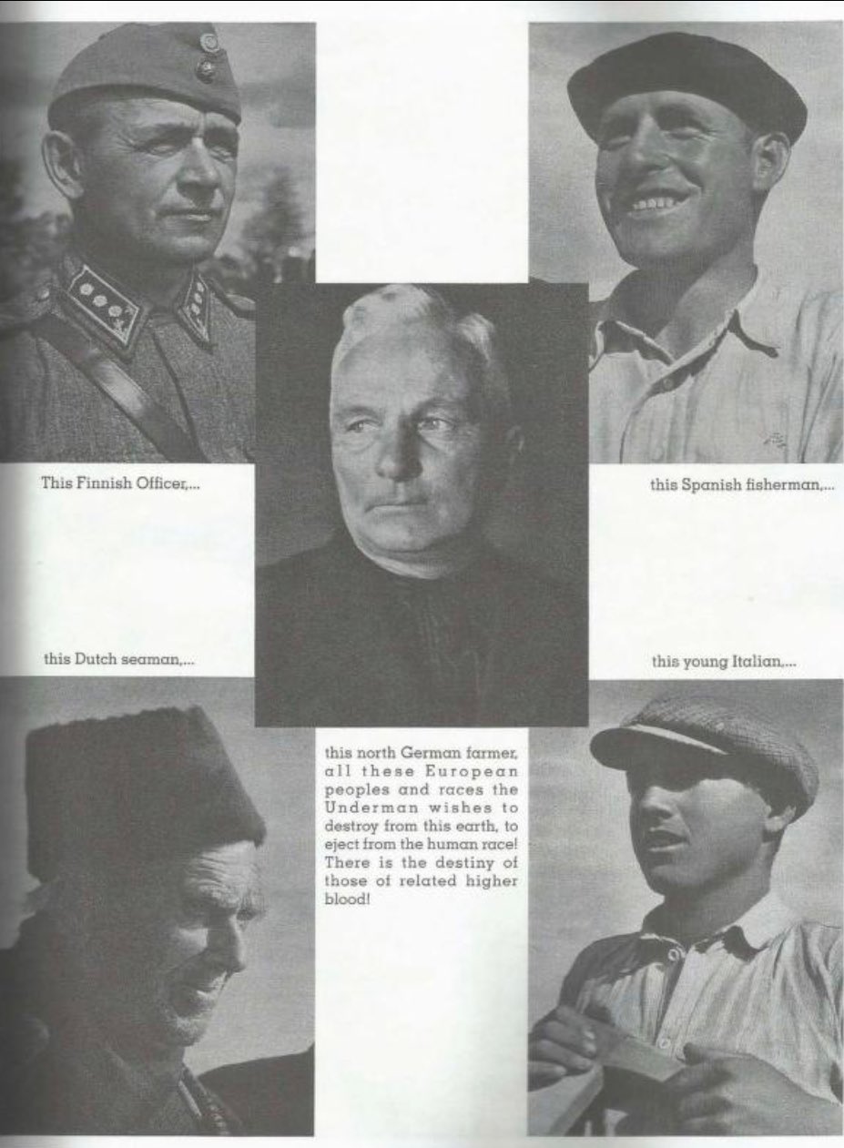 Nowhere in the SS book are the Slavic people denigrated, and in fact many of the traditional Slavic nations are mentioned in text and photograph as being part of the greater European family. European nations specifically mentioned in this book include Portugal, Spain, Italy, France, Belgium, the Netherlands, Denmark, Norway, Finland, Italy, Switzerland, Slovakia, Croatia, Greece, Bulgaria, Hungary, and Romania.